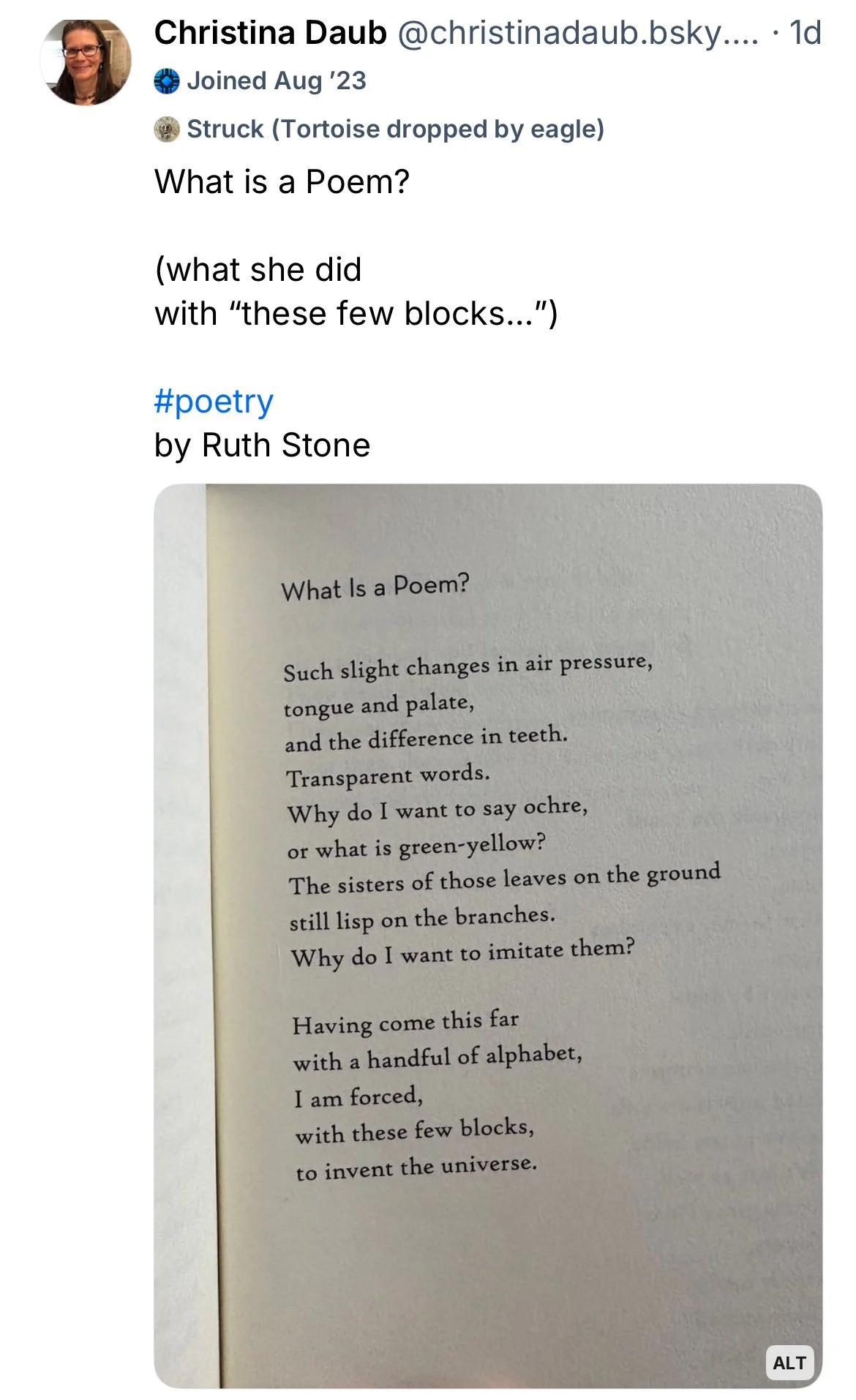 The title of this poem is a question that can never definitively be answered but how beautifully Ruth Stone does answer it here. Notice how she makes poetry—its structure and the very language—physical: the “building blocks” of stanzas, the feel of words and letters in the mouth, the leaves on the trees and on the ground.