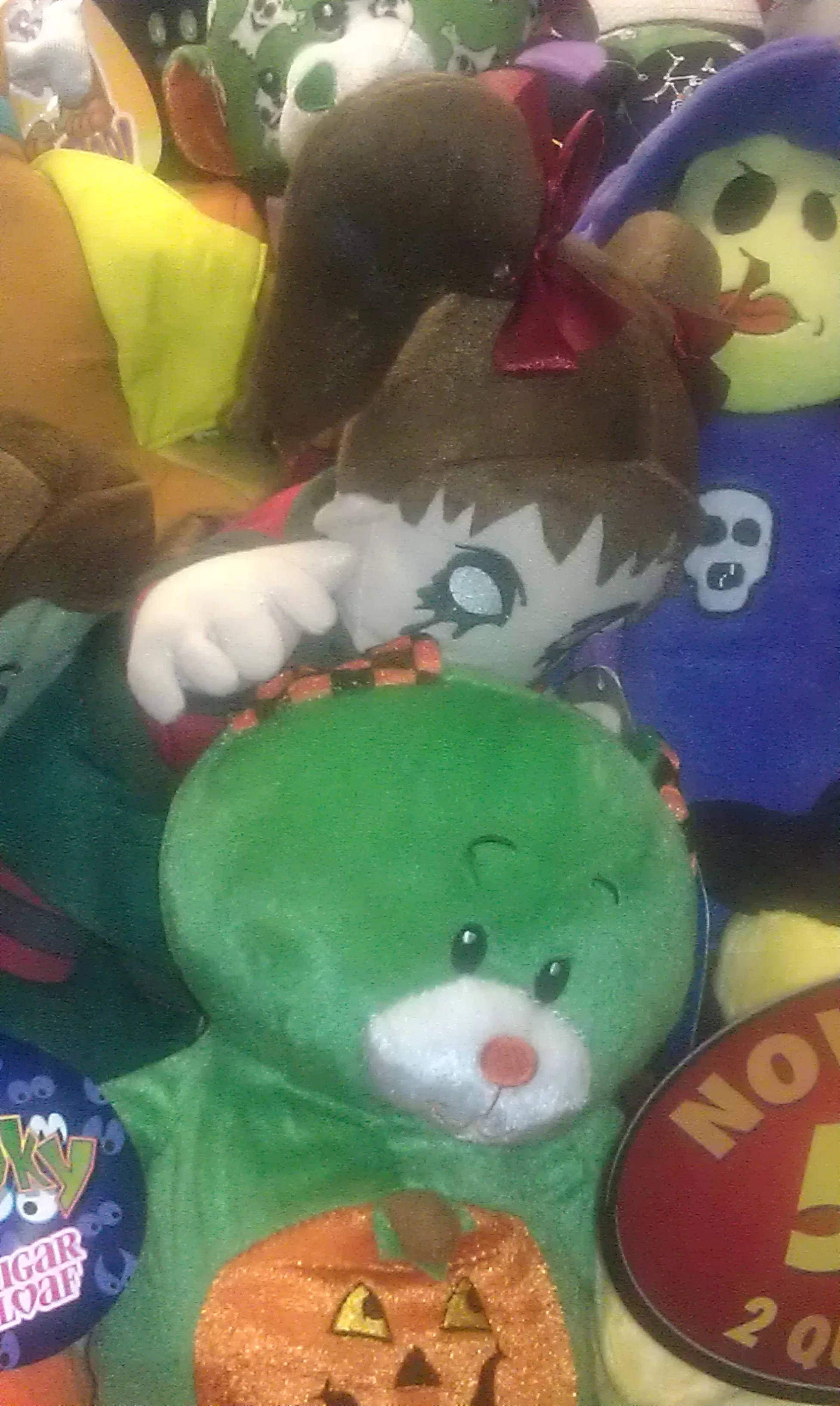 Extra bonus prompt: write about a zombie attack or whatever this doll planning to do to the green bear (the pumpkin seems to know something is up).