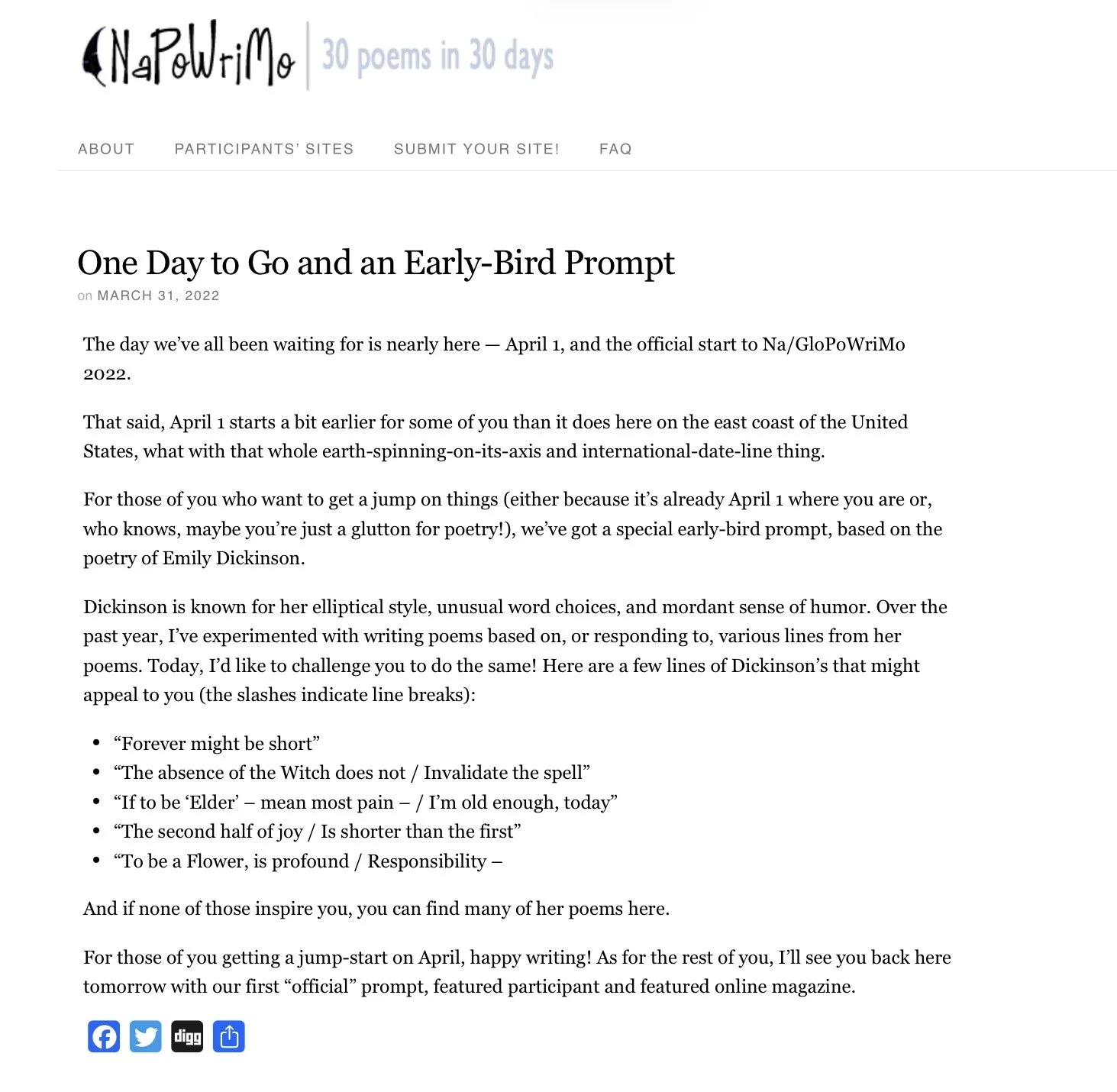 Let the borrowing begin with posting NaPoWriMo’s early bird prompt from 2022, https://www.napowrimo.net/2022/03/. Maureen Thorson began NaPoWriMo back in 2003 and got help to create the website, https://www.napowrimo.net. It is a great resource for anyone wanting to participate in the challenge or looking for writing prompts throughout the year. Please do check out the official site: https://www.napowrimo.net. There be an early bird prompt posted tomorrow. Also, if you want to share your daily poems, you can submit your website/blog’s link (the site’s FAQ explains how).
