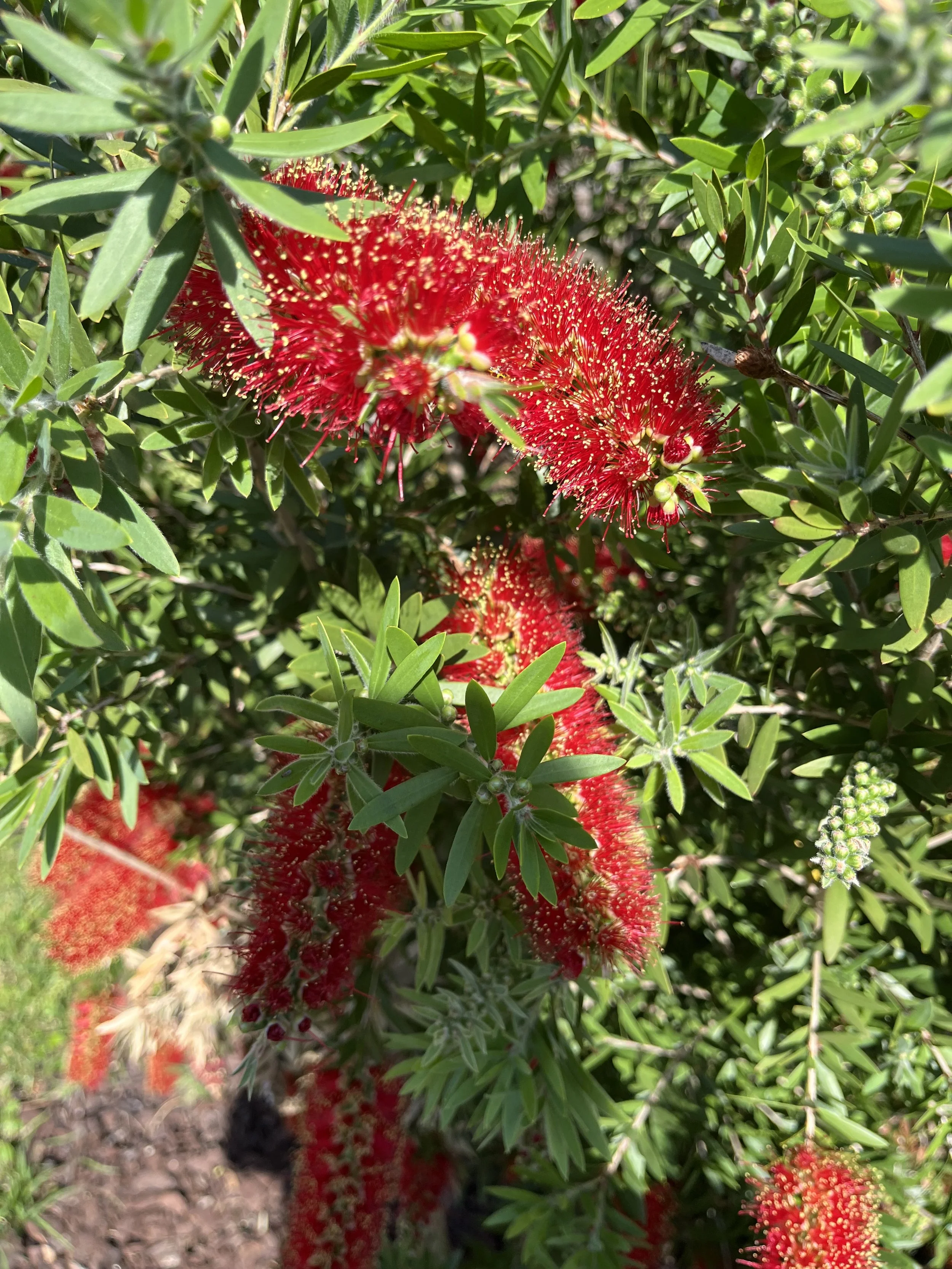 Yes, I know I should post a photo of a tree in all its green glory, but this bottlebrush is the one I see outside kitchen window. This is the tree that welcomed us into this home and entertains us and the cats with the birds it provides a landing, the same tree we thought lost to the harsh winter and had to cut down to almost the ground. It is back and beautiful. The shadow is mine, as I admire its healthy blooms.