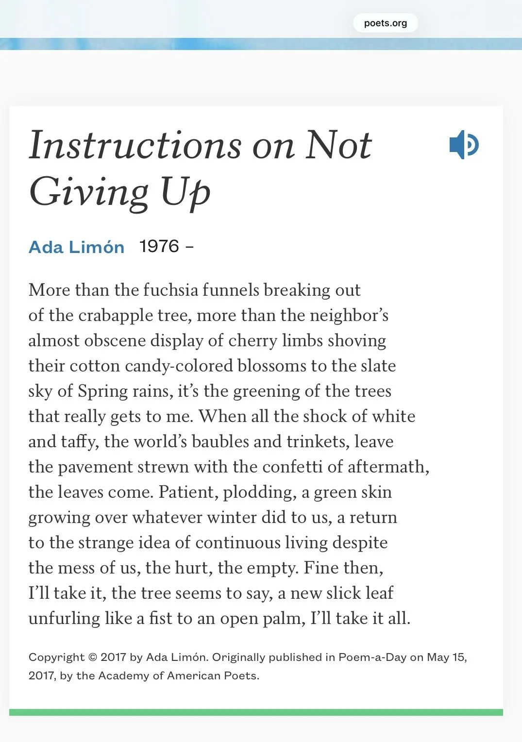 There was good news in the world today, but it has been a hectic week, and I needed this poem. I hope reading it helps you too. If you want to listen to the poet read it aloud, click on the link: https://poets.org/poem/instructions-not-giving.