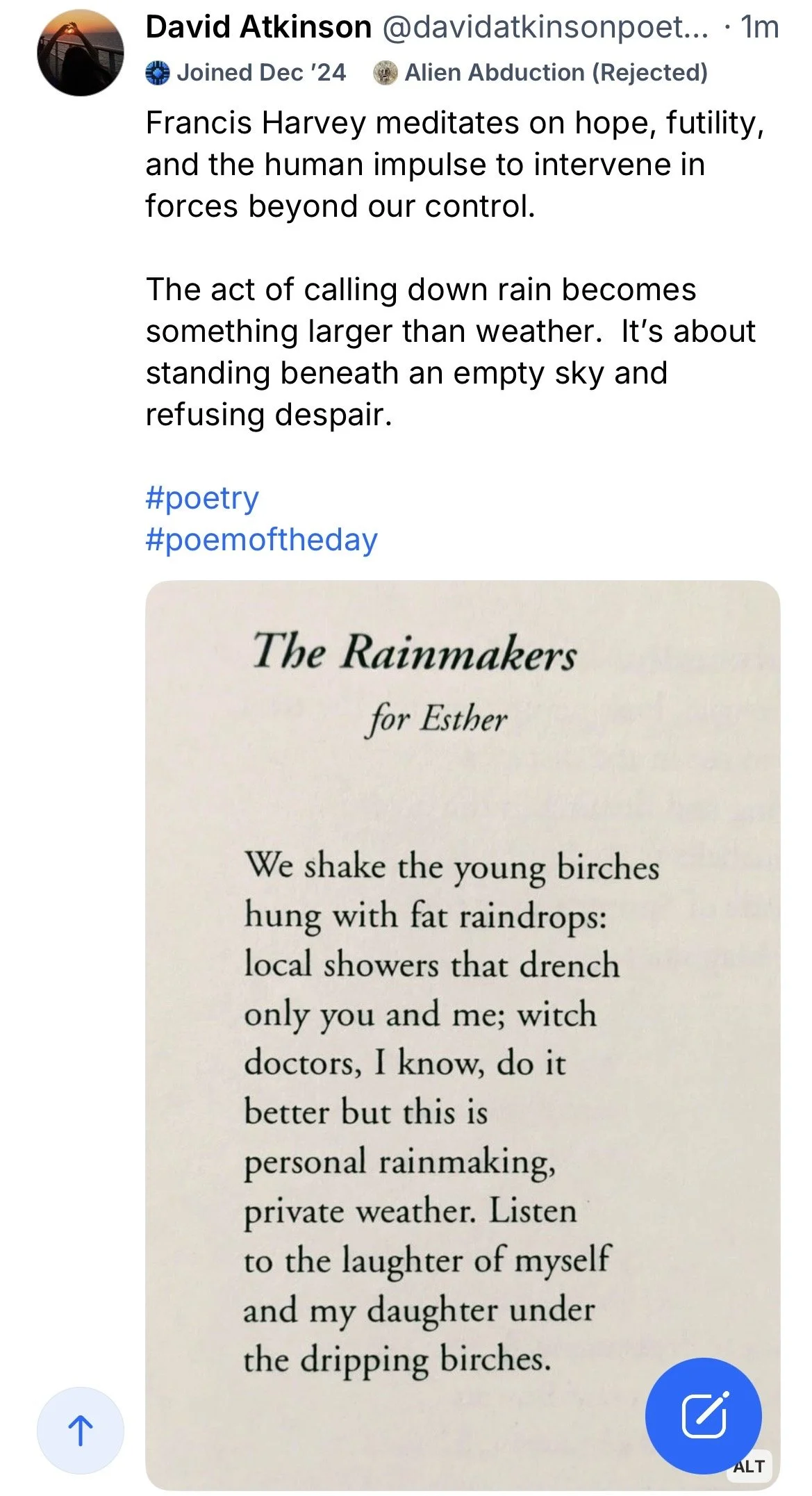 I enjoy others’ enjoyment, the sharing of poems and appreciation of their artistry. The imagery in Francis Harvey’s “The Rainmakers” is lovely, and likewise David Atkinson’s response.