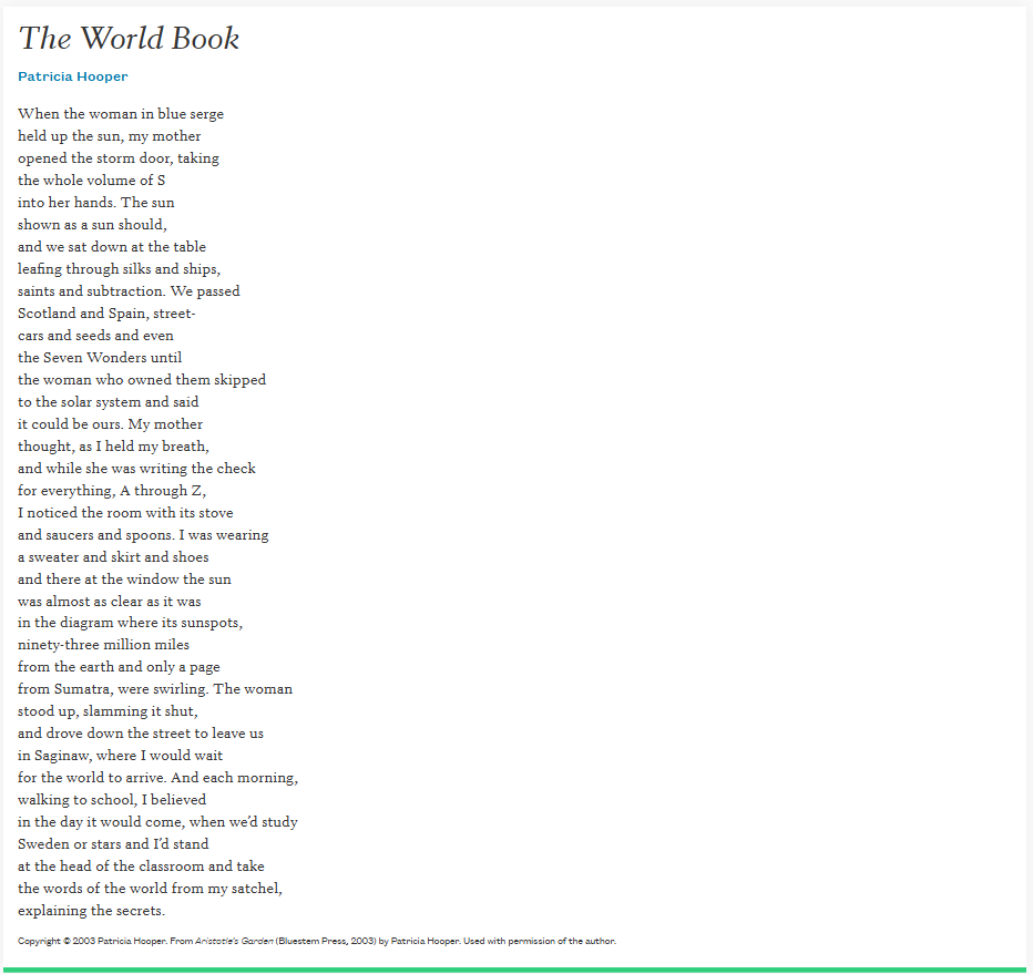 If you want to hear Patricia Hooper read “The World Book” aloud, click on the link: https://poets.org/poem/world-book.