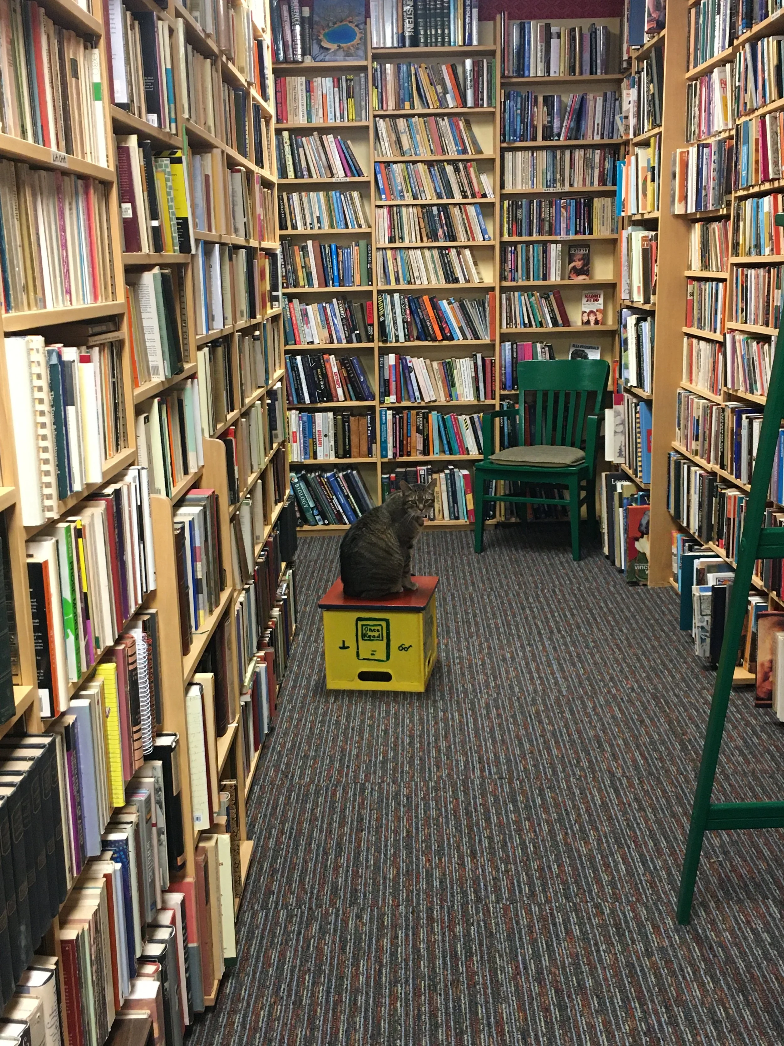 Bonus prompt: what question does the bookstore’s feline guardian ask and what answer do you give to gain admittance?