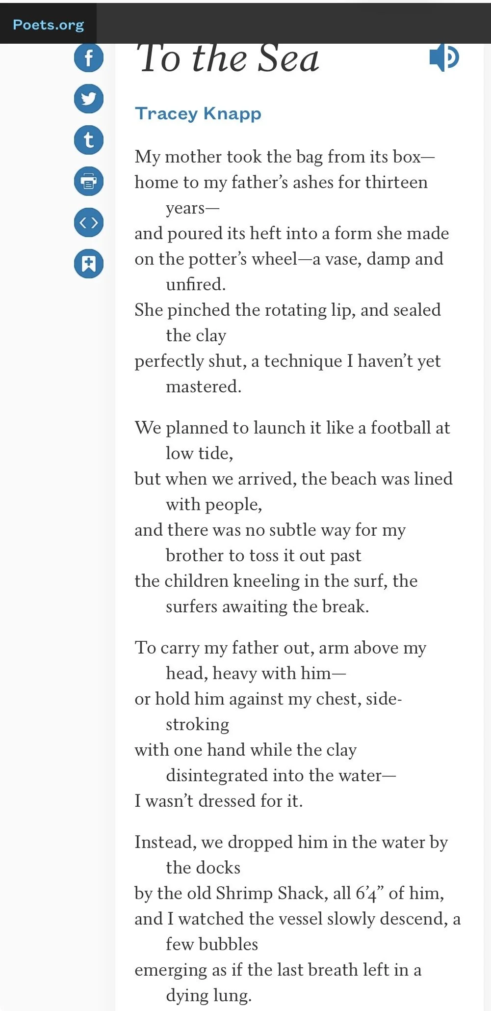 To read about what inspired this poem and hear the poet read “To the Sea” aloud, click on the link: https://poets.org/poem/sea-3.