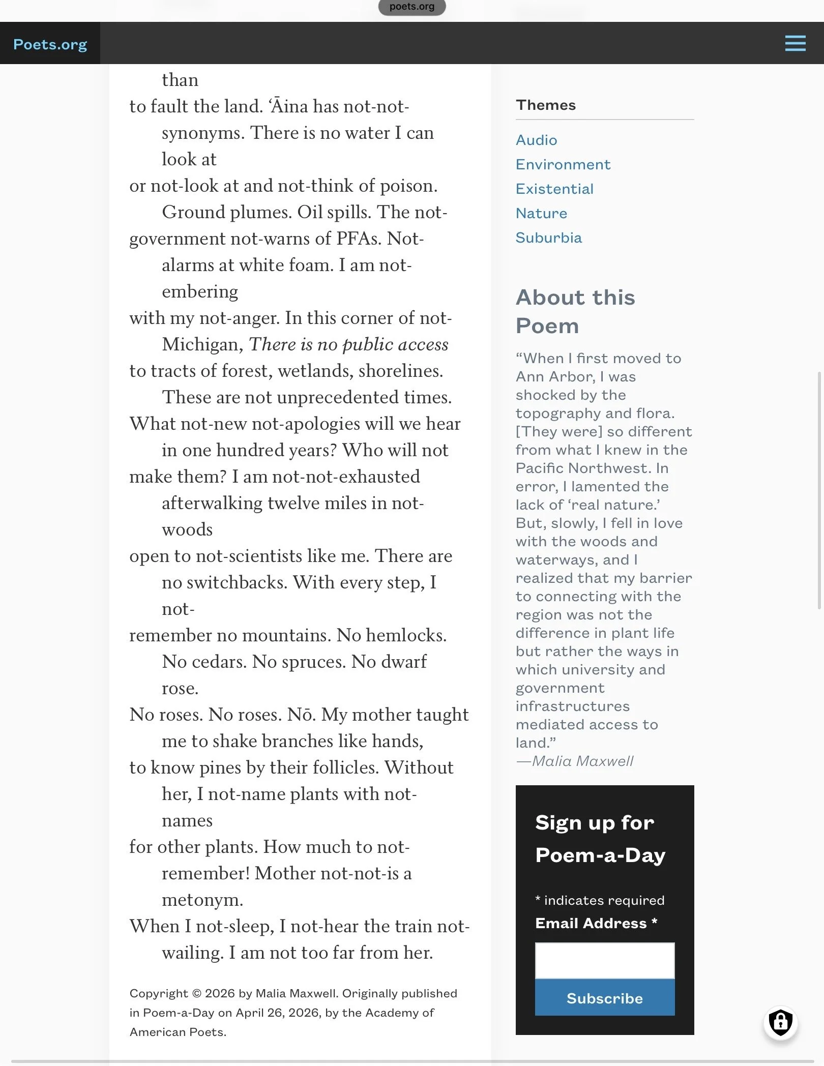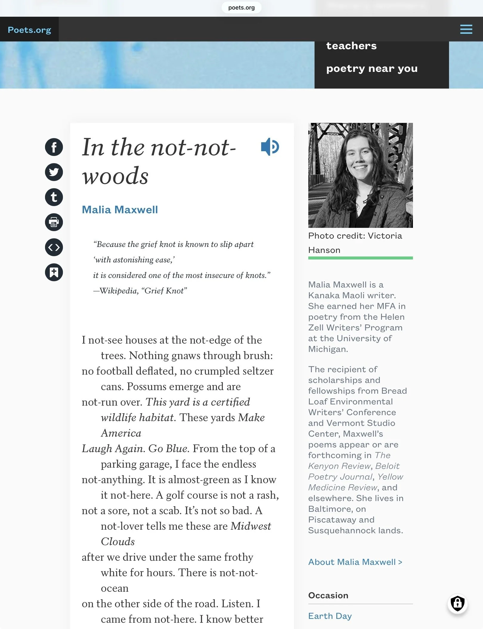 “In the not-not-woods” is a poem that rewards multiple readings. I hope you like it as much as I did. If you want to listen to the poet read it aloud, click on this link: https://poets.org/poem/not-not-woods.
