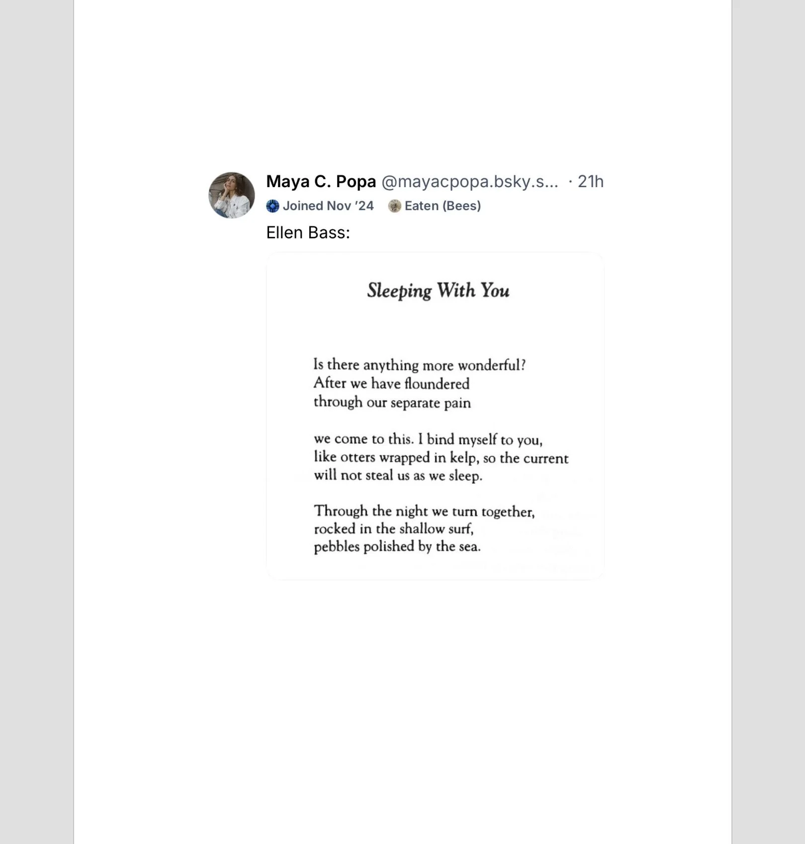 Here is another beautiful love poem. Ellen Bass is a treasure.