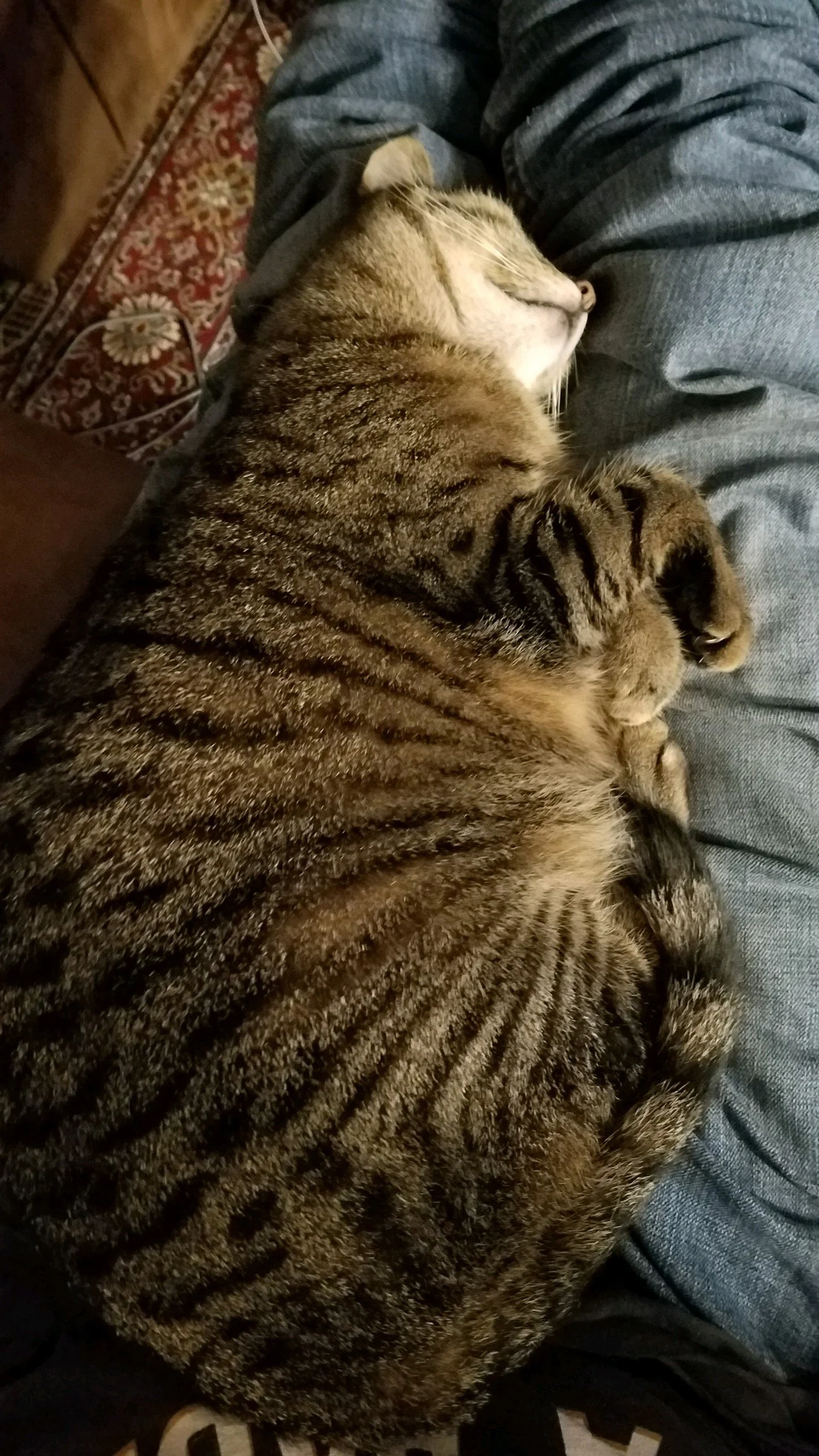 Bonus prompt: Here is Pebbles sleeping on a lap. Write a poem about cuddling with a pet.