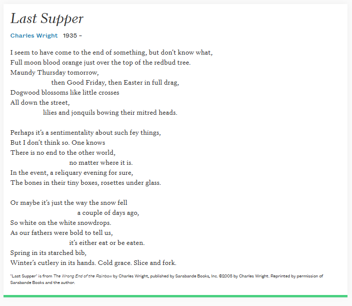 Charles Wright has such beautiful descriptions of nature and a depth, again that layering I so admire. Here is a lovely poem I hope you will like too.