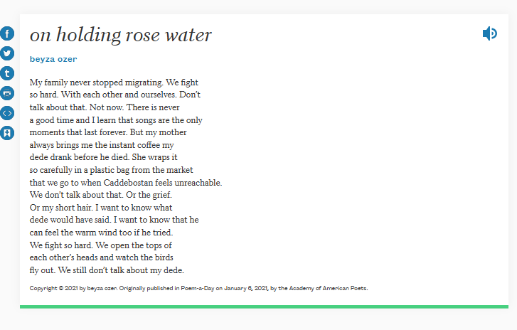 Here is a beautiful poem by beyza ozer, https://poets.org/poem/holding-rose-water.