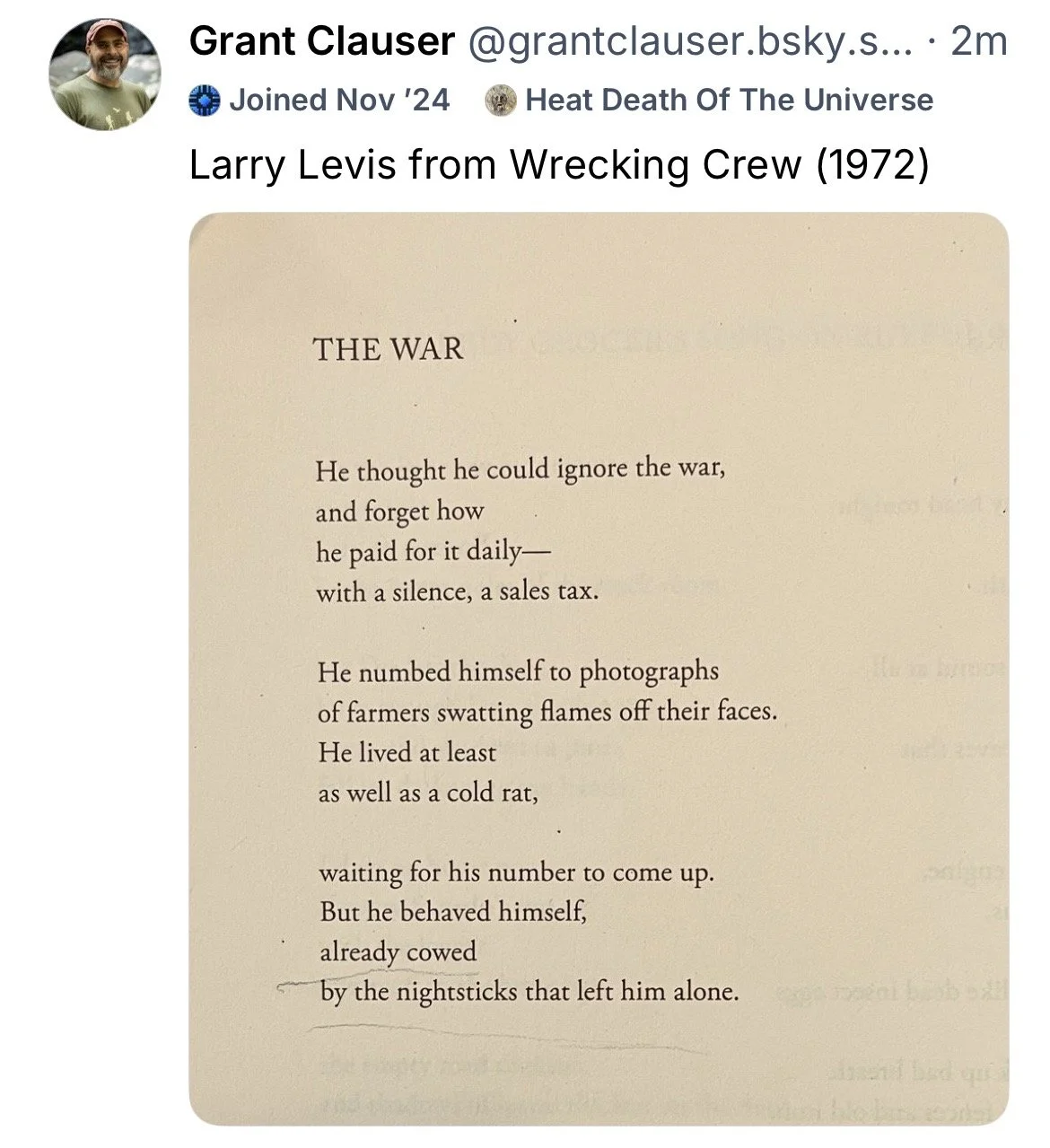 Larry Levis is a great poet. His poem from 1972 is powerful, the language gutting and—unfortunately—apt today.