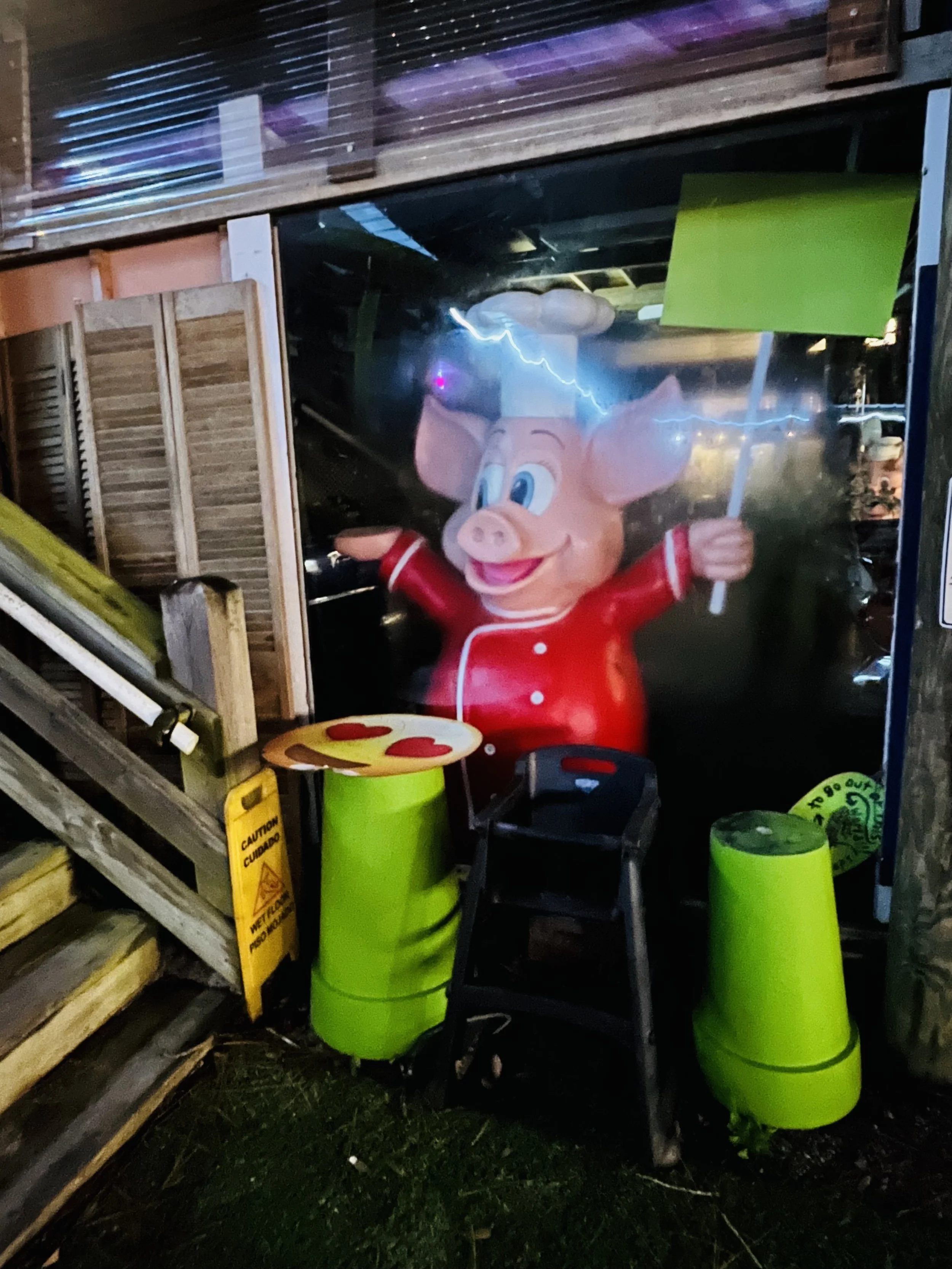 Bonus prompt: why is this pig statue so happy at a bbq joint?