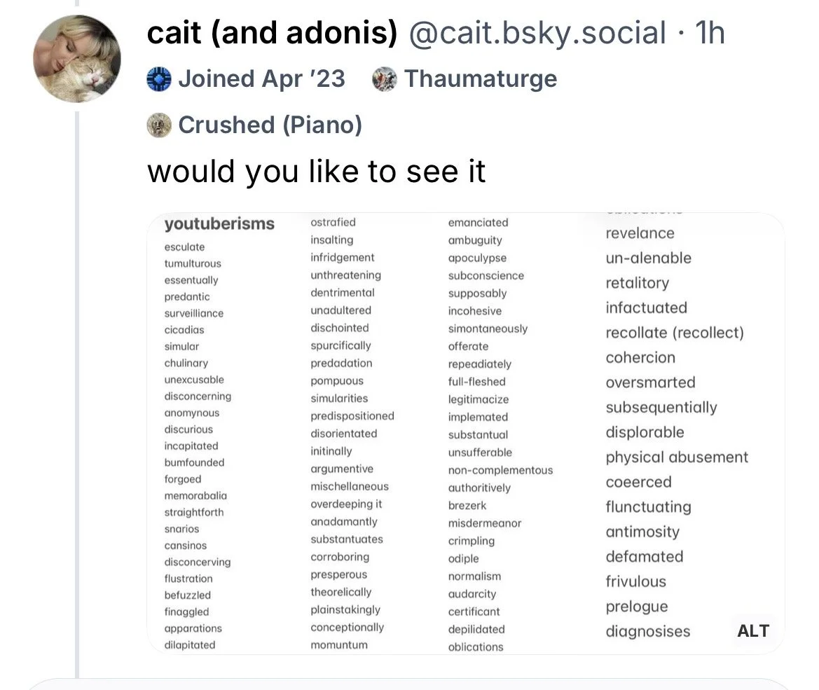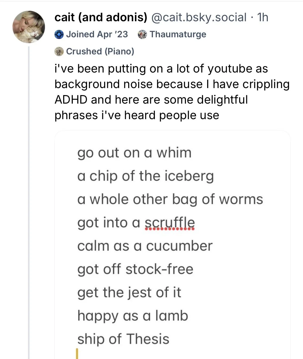 Let’s try something a little different tonight. Rather than building prompts from a particular poem, let’s play with missed-phrasings. Cait, mother of perfect kitty Adonis, shared a list of malapropisms (using words that don’t fit the context or in a common phrase, often similar sounding to the correct word).