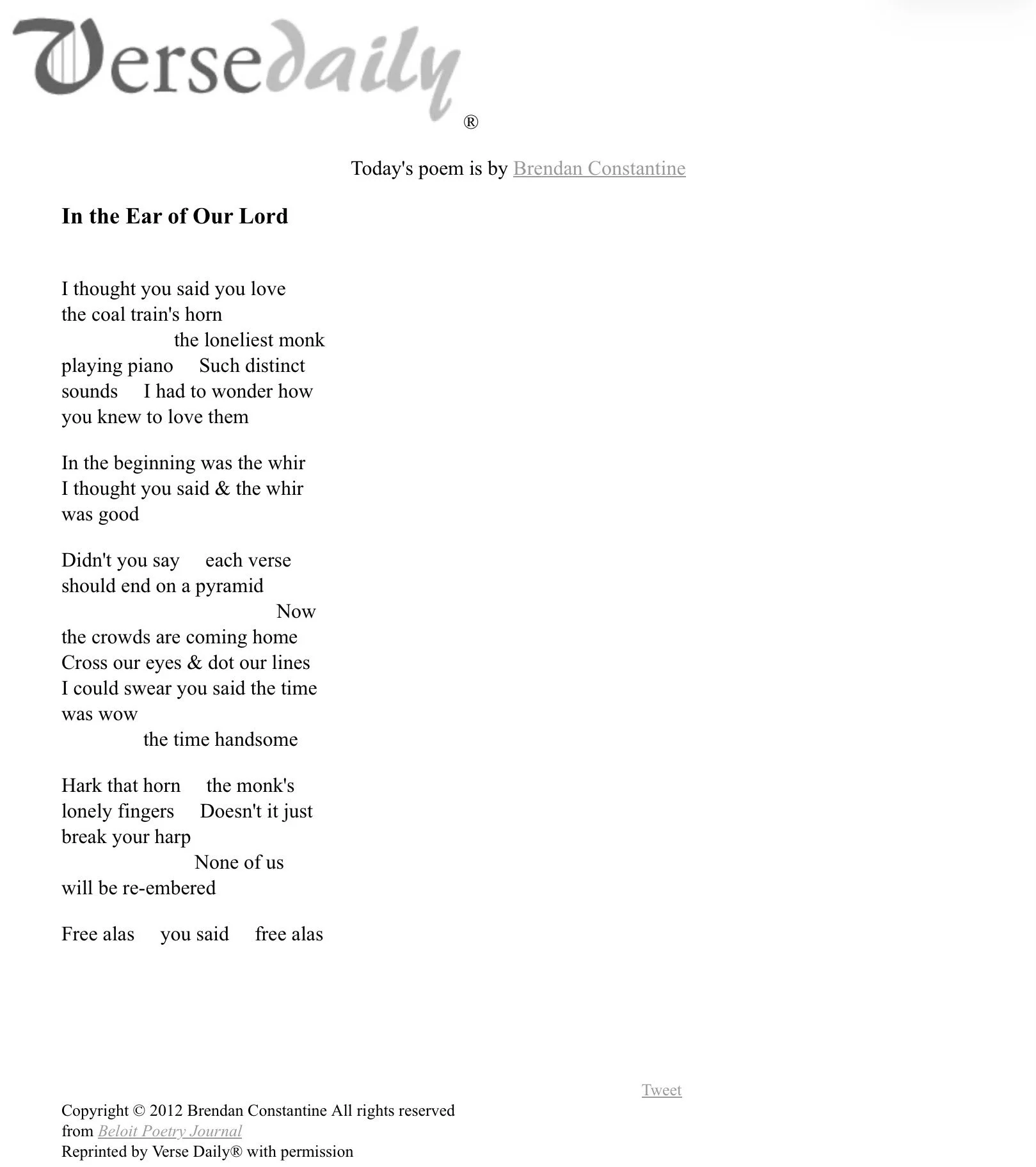 Here is a fabulous poem by Brendan Constantine: https://www.versedaily.org/2013/earofourlord.shtml